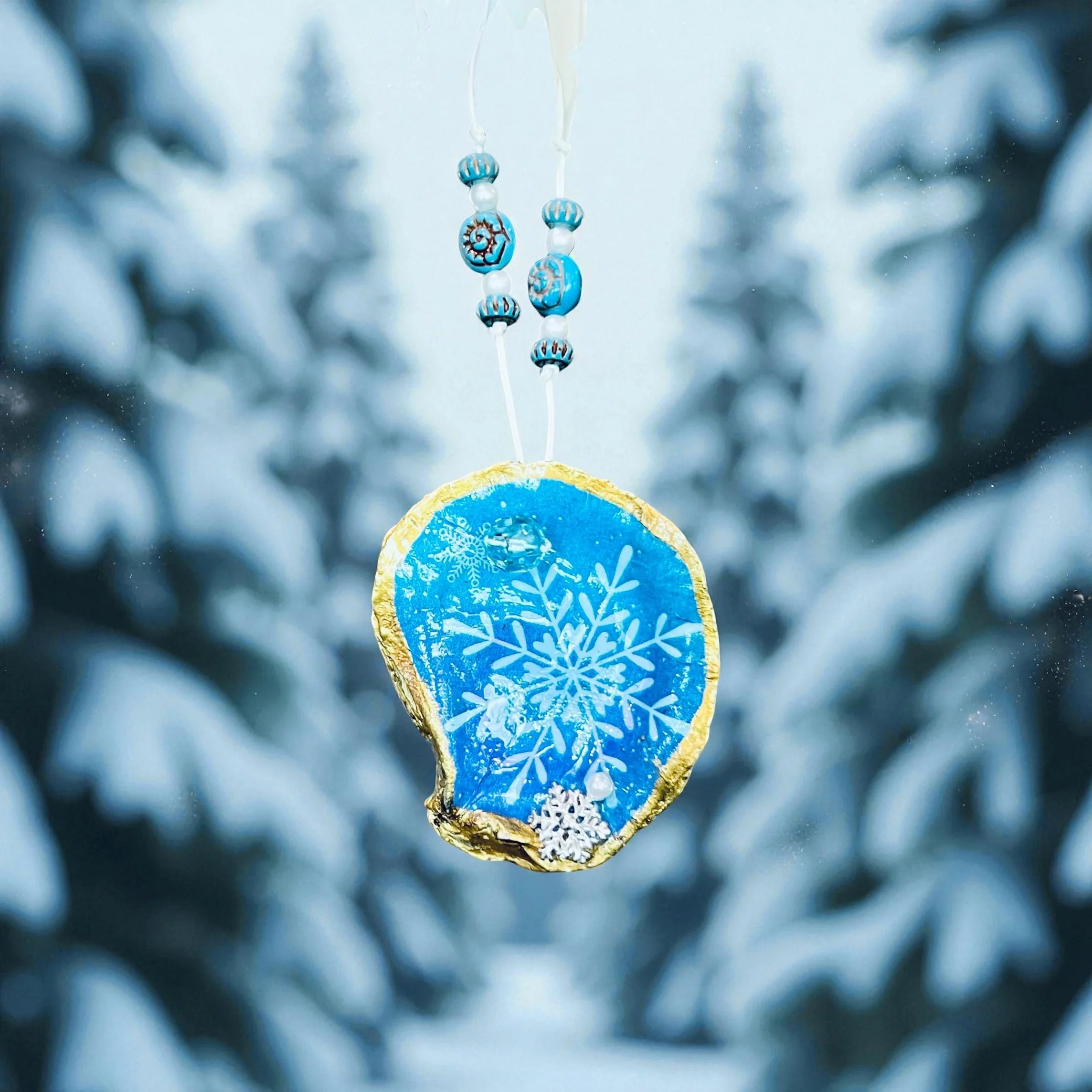 Add a touch of coastal magic to your holiday décor with this Winter Snowflake Oyster Shell Ornament. Hand-painted in brilliant icy blue and accented with delicate white snowflakes, this ornament captures the serene beauty of a snowy winter’s day by the sea. The natural oyster shell is carefully trimmed in shimmering gold leaf, giving it a touch of elegance and festive sparkle.