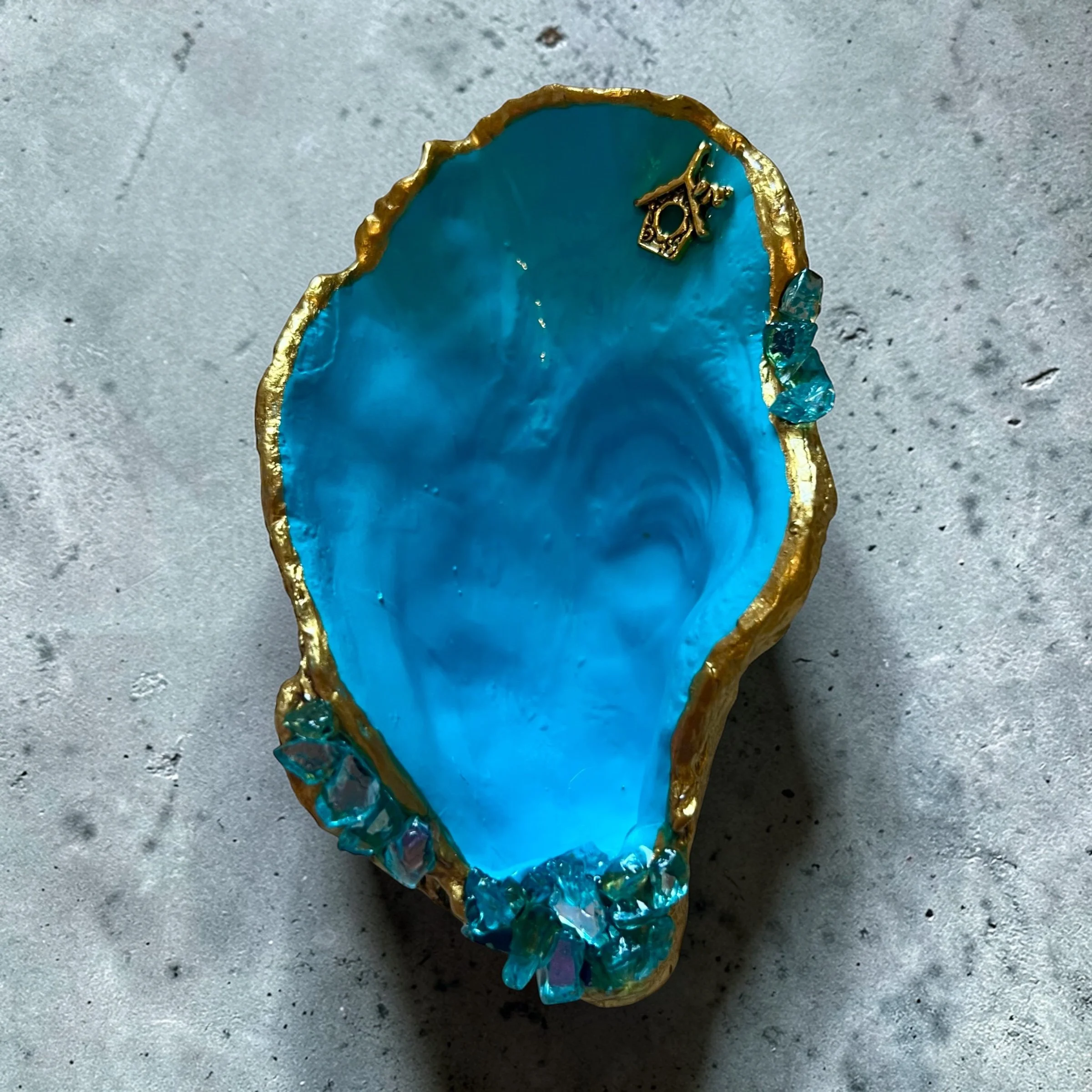 Add a touch of coastal sparkle to your space with this one-of-a-kind hand-painted oyster shell jewelry dish. The interior glows with vibrant turquoise tones, finished in a glossy sheen that captures the light like sunlit ocean water.