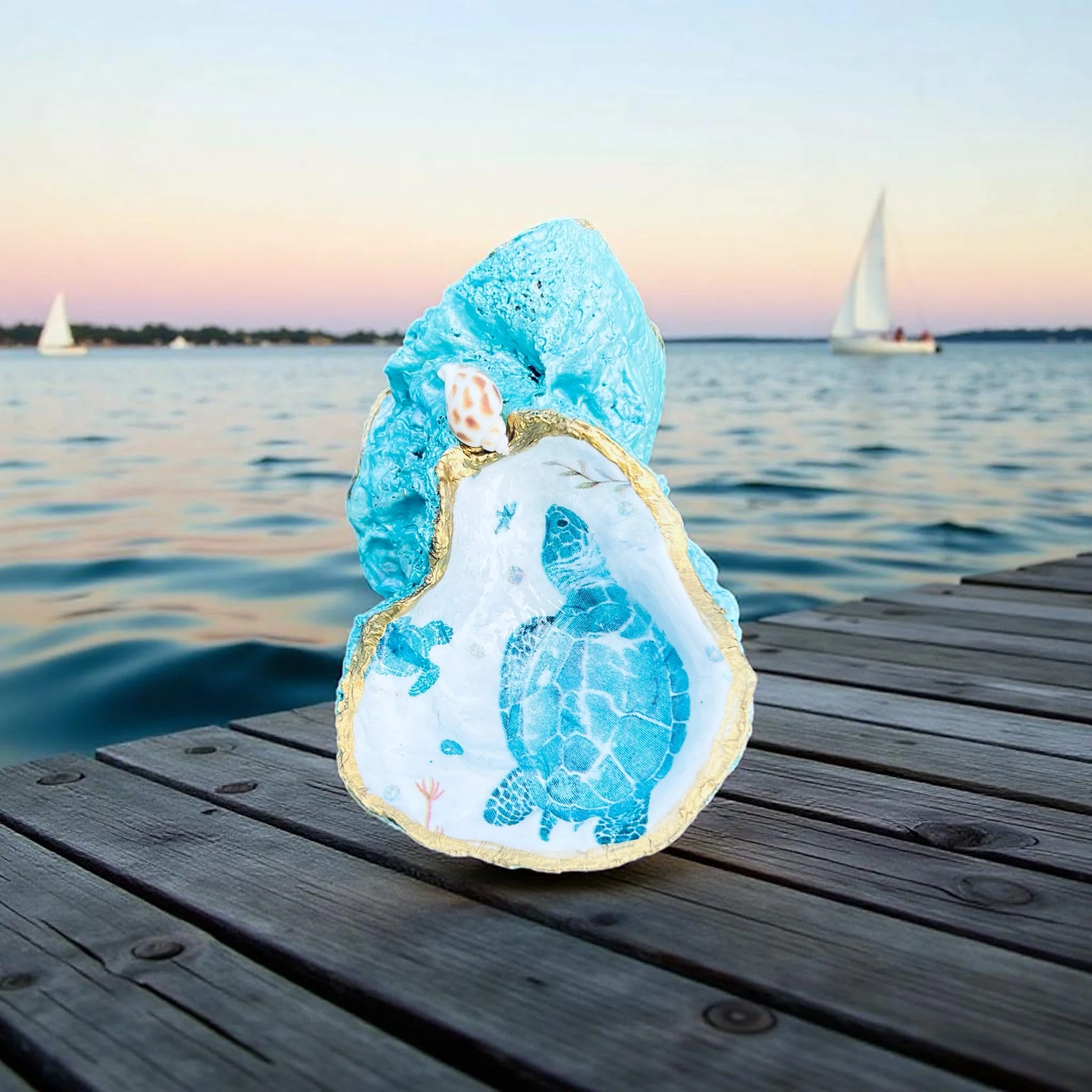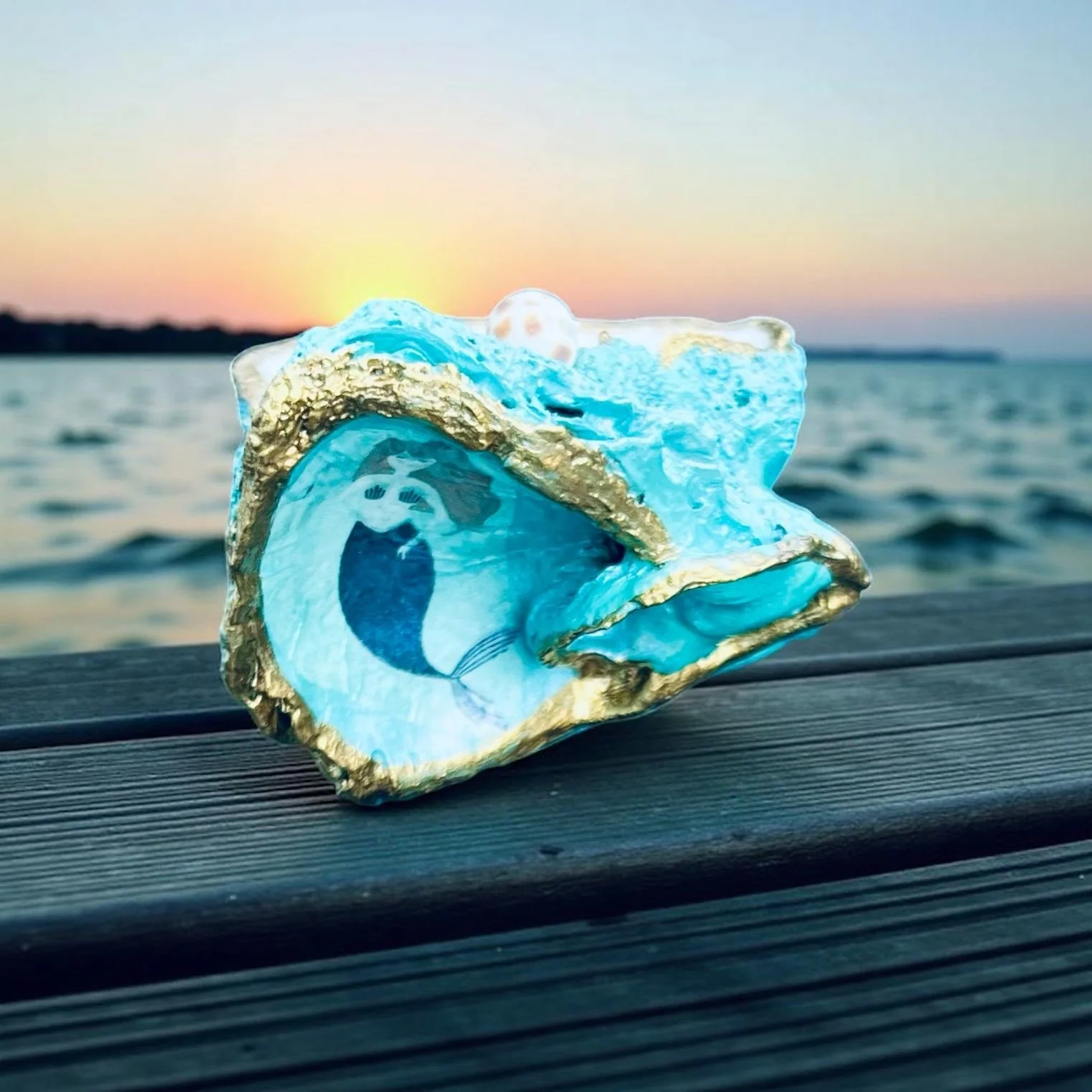 Bring a splash of seaside magic into your home with this one-of-a-kind oyster shell trinket dish. Hand-painted in vivid turquoise and accented with shimmering gold edges, its unusual, organic shape makes it a true conversation piece. Inside, delicate coastal artwork—featuring sea turtles and mermaids—adds a whimsical touch inspired by the ocean’s beauty.
