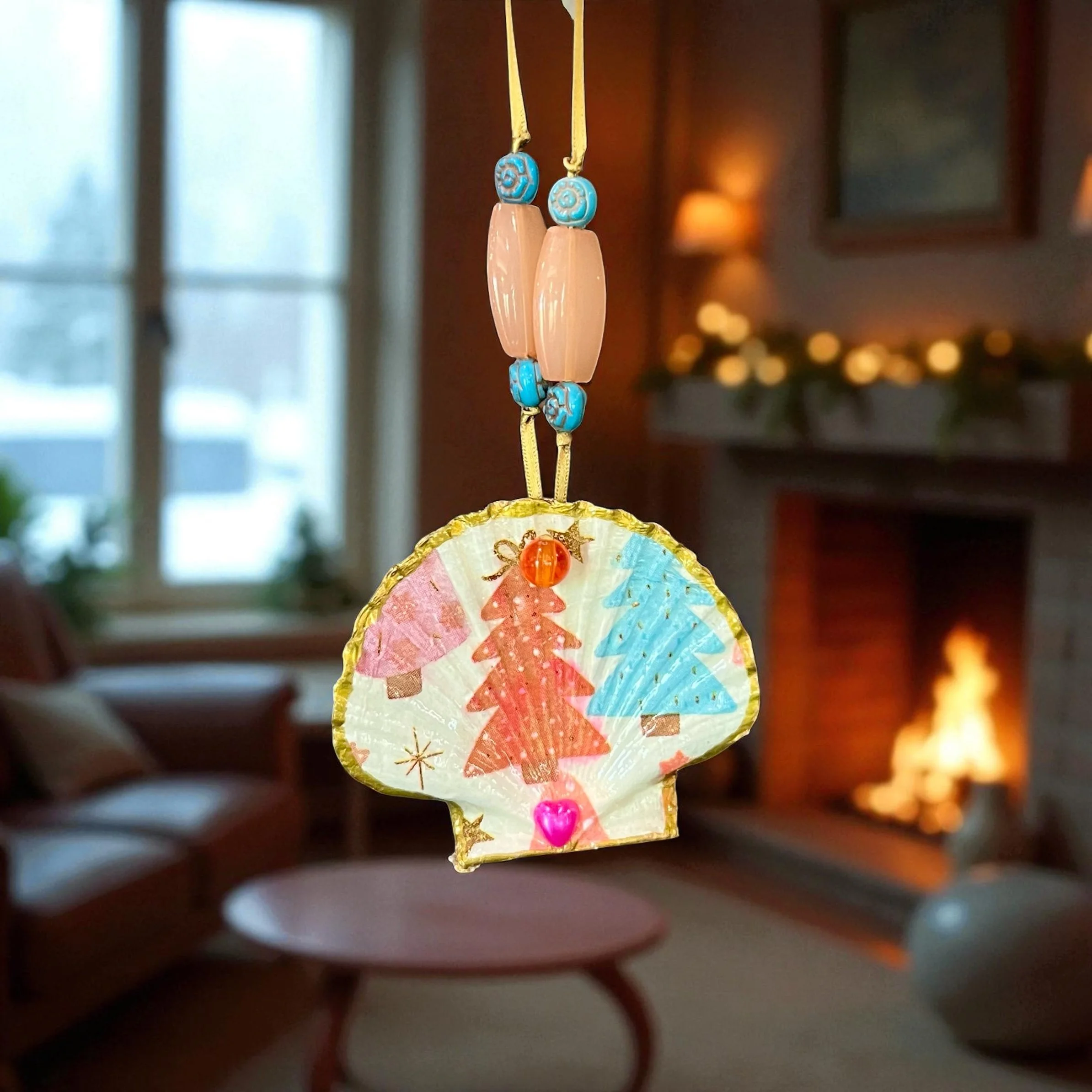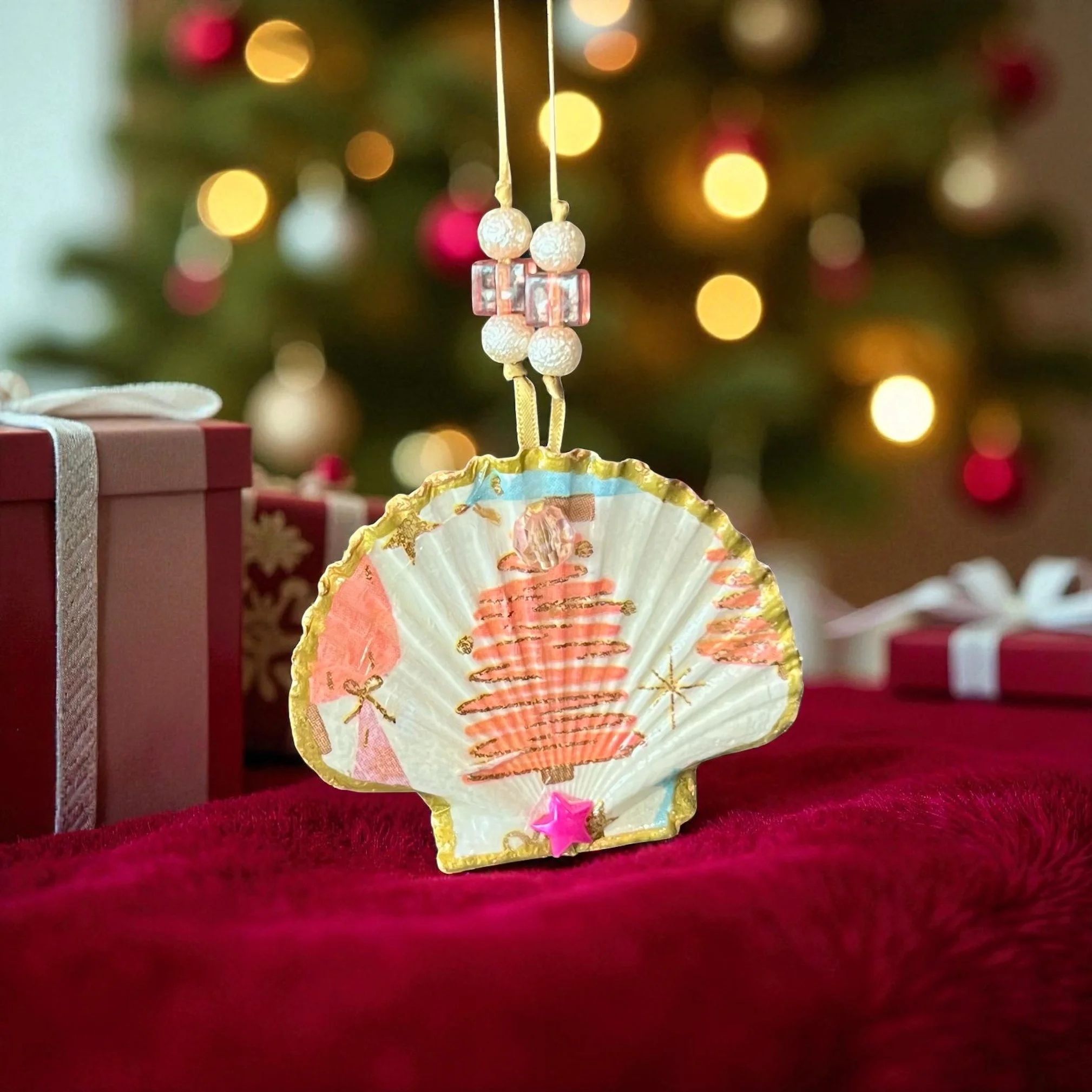 Bring seaside charm to your holiday décor with these handcrafted seashell Christmas ornaments. Each ornament is made from a natural scallop shell, beautifully decoupaged with whimsical Christmas tree designs in shades of coral, turquoise, and blush pink. Accented with shimmering gold details and tiny starbursts, they capture the magic of both the ocean and the season.